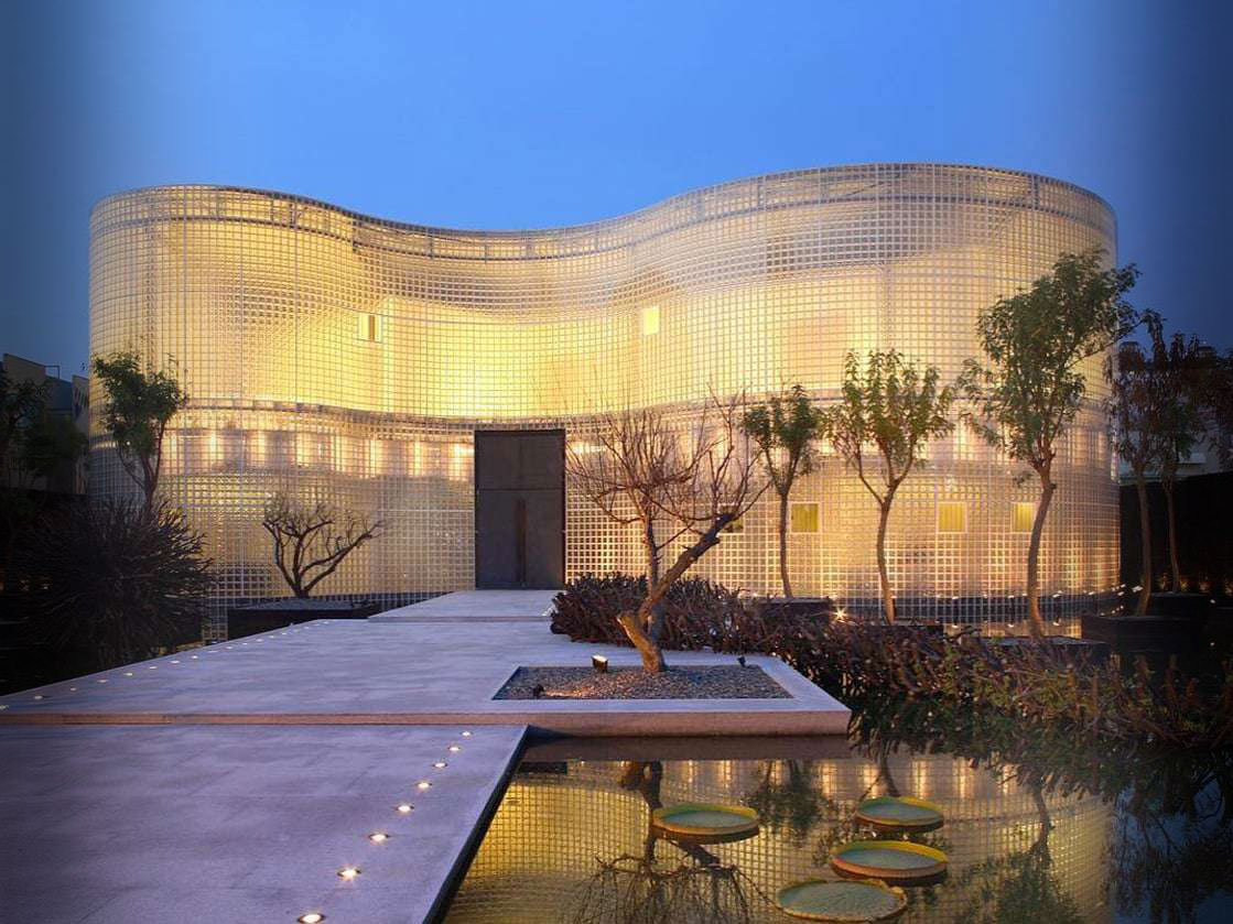 리셉션센터의외관은 웨이브 패턴이 있는 반투명 유리블록으로 구성되어 자연을 반영합니다. 이를 통해 자연광으로 실내를 밝히는 동시에 단열 및 방음효과를 제공합니다