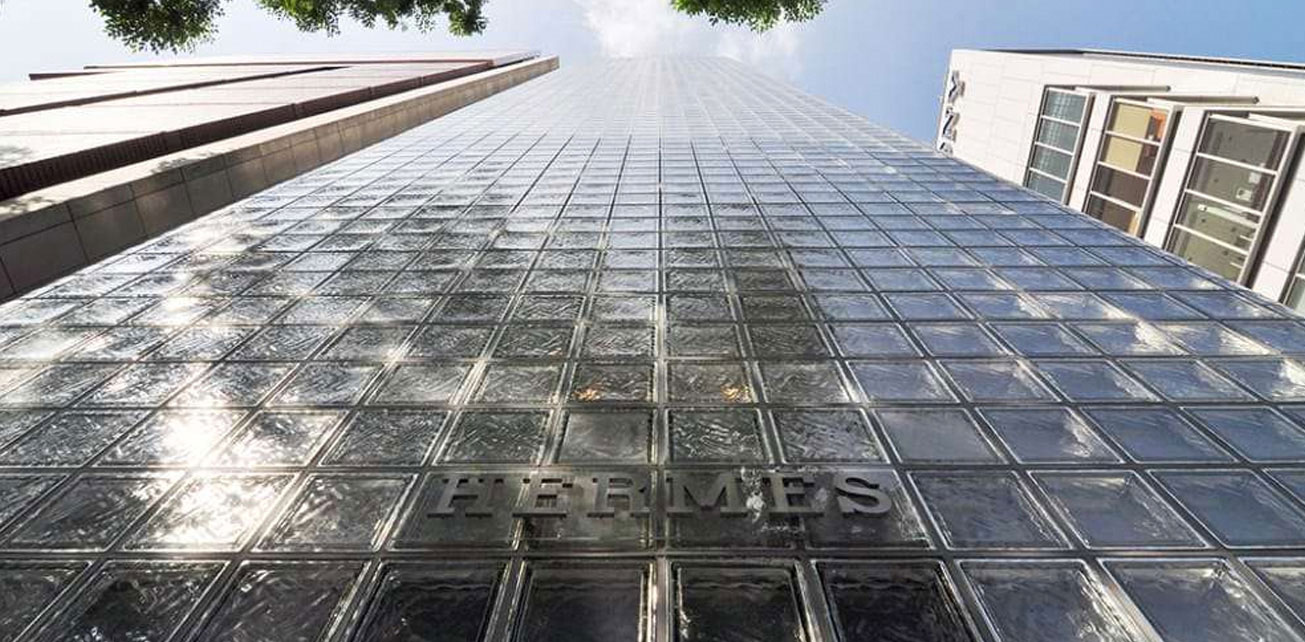 •에르메스 건물의 빛나는 반사를 강조하는 우아하고 세련된 디테일